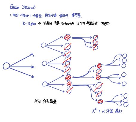 - 모든 누적 확률을 계산하는 것이 불가능하기에, k개의 빔을 설정하고 Beam Search에 활용한다.