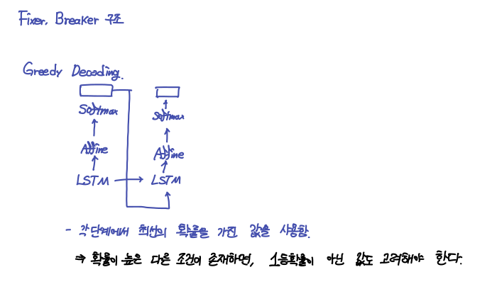 - 특정 시점에서 후보군들의 확률을 계산하고, 2등, 3등의 확률은 전혀 신경쓰지 않고, 1등만 신경쓰므로, 만약 1등과 2등의 차이가 작고, 2등이 맞는 답이라면, 이전 예측이 중요한 Decoder의 역할은 제대로 수행되지 못할 것이다.