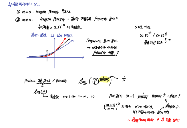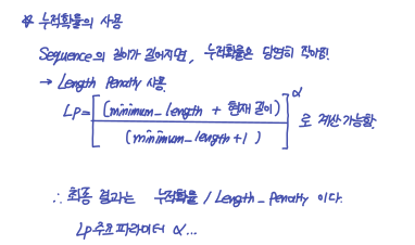 이런 문제를 해결하기 위해, Beam Search 방식에서의 누적 확률 계산은 Length Penalty를 이용한다.