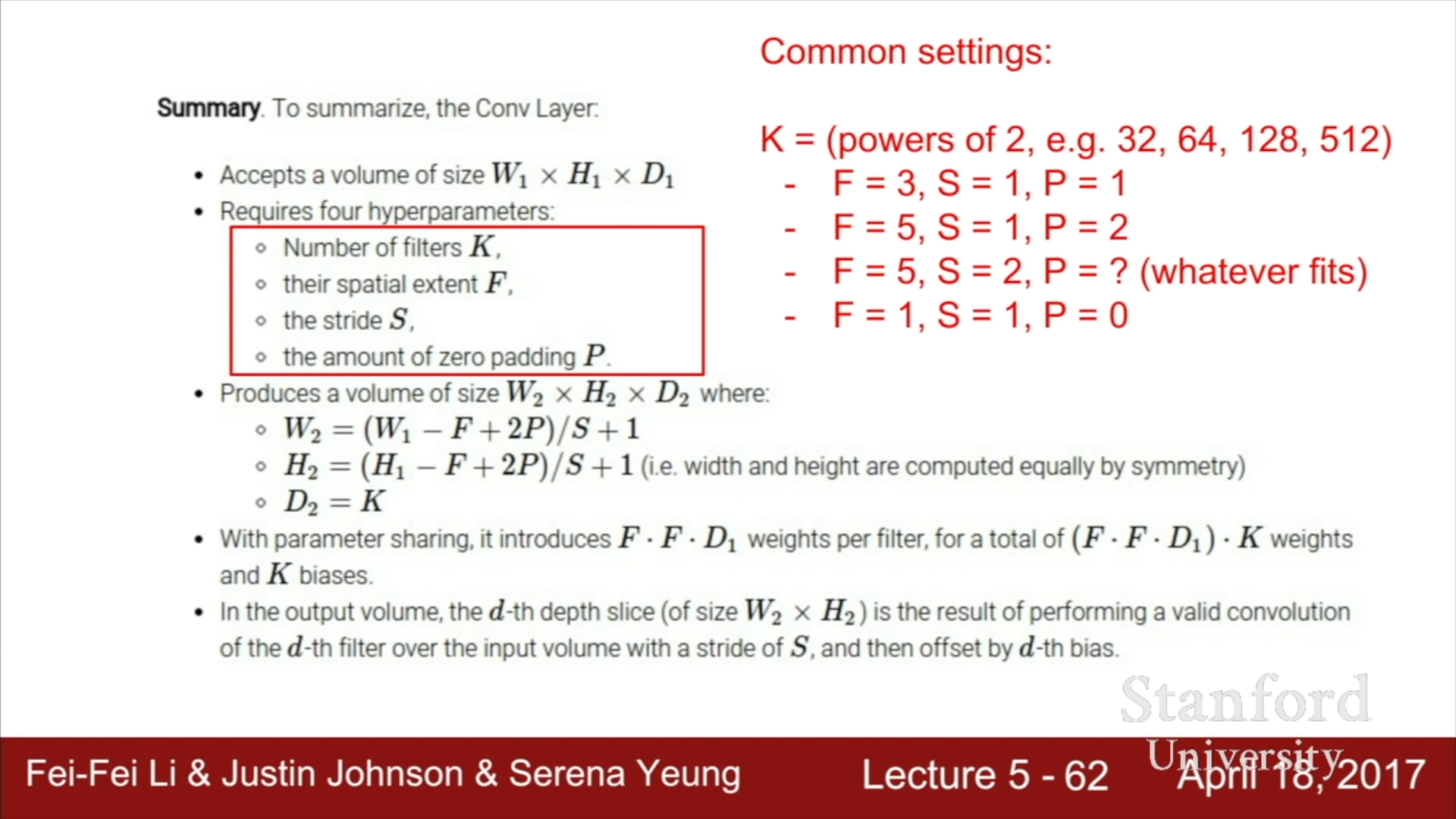 - Spatial dimensions of CONV
