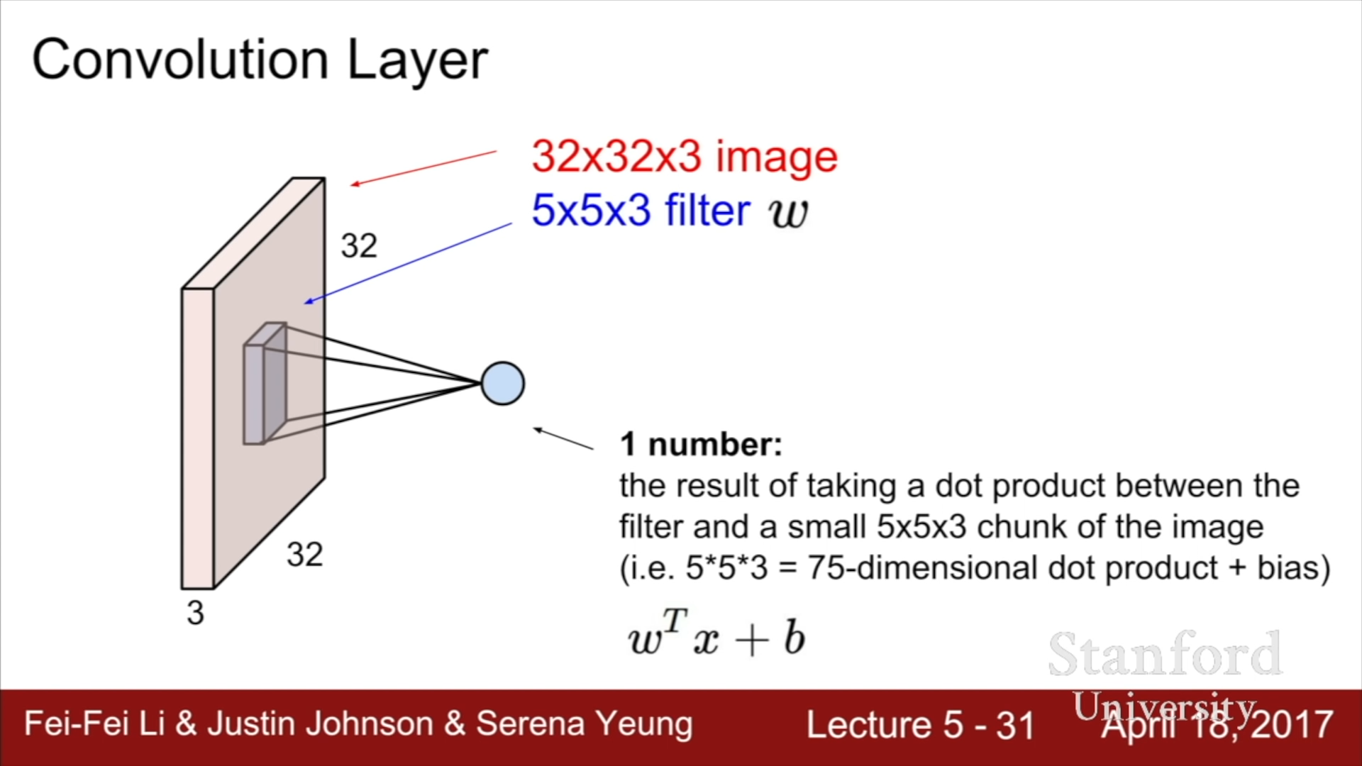 이 연산에서는 Filter를 Image matrix 위에 두고 일정 크기만큼 이동시키며 filter의 각 요소들에 상응하는 Image value들과 filter value의 곱의 합으로 생각할 수 있고, 혹은 해당 Value들과 Filter를 하나의 1x75 크기의 벡터로 형성한 뒤, 두 벡터의 내적을 수행하는 방식으로 생각할 수 있다.