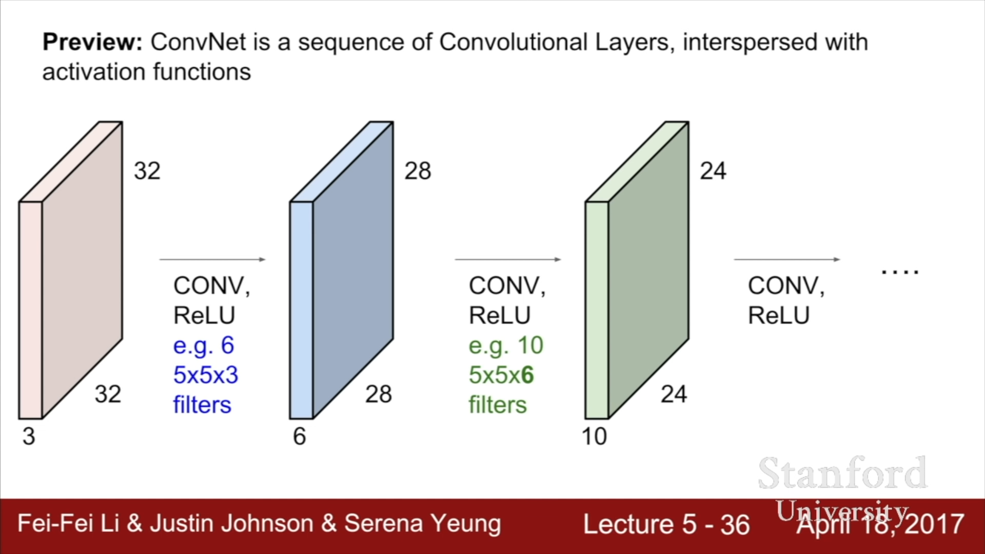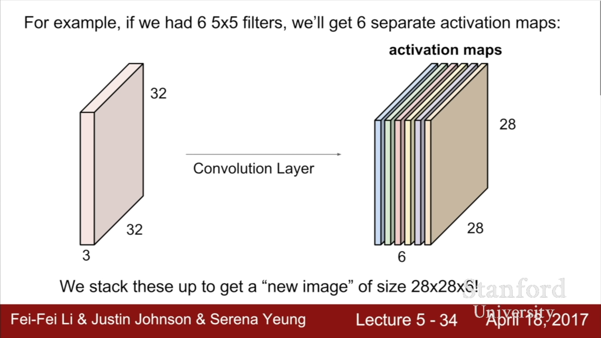 Filter를 옆으로 한 칸씩 이동시키며 연산을 수행해나간다면, (32 - 5 + 1) x (32 - 5 + 1) 크기의 Activation map이 형성된다. 이때, 각 Filter는 어떤 특정한 종류의 Template이나 Concept에 대한 결과를 살펴보는 것이기에 하나의 Filter를 사용하는 것이 아닌 여러 Filter를 사용하게 된다. 만약 6개의 Filter를 사용하게 된다면, 다음 계층의 입력 정보는 6의 Depth를 가지게 될 것이다.