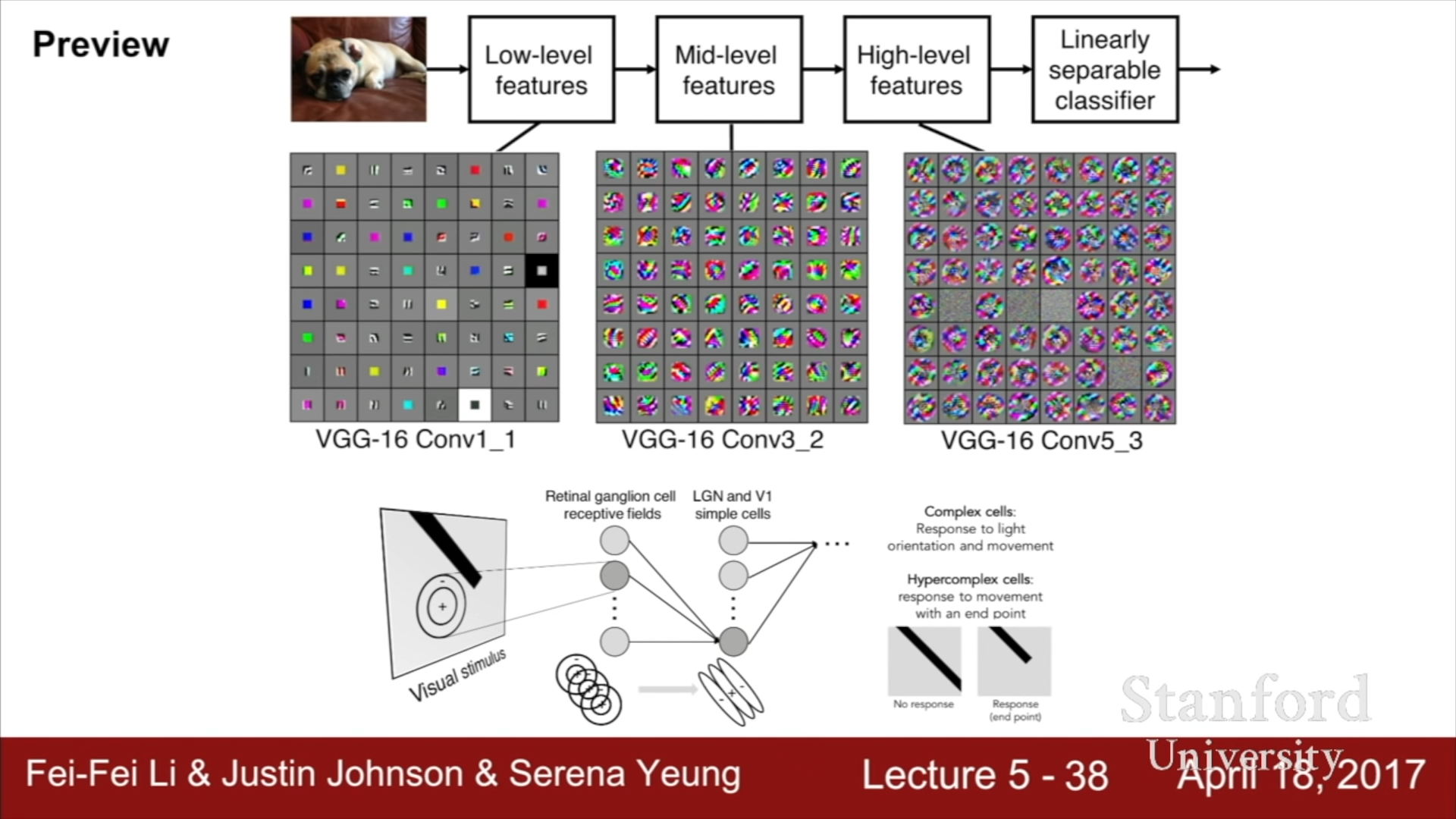 ConvNet 구조를 활용한다면, 하위계층에서는 이미지의 경계와 같은 하위 정보를, 상위 계층에서는 더 복잡한 상위 정보를 담는 구조가 형성되는데, 이는 인간이 의식적으로 이를 강제하지 않았지만 Hubel과 Wiesel의 연구와 매우 유사하다는 점을 파악할 수 있었다.