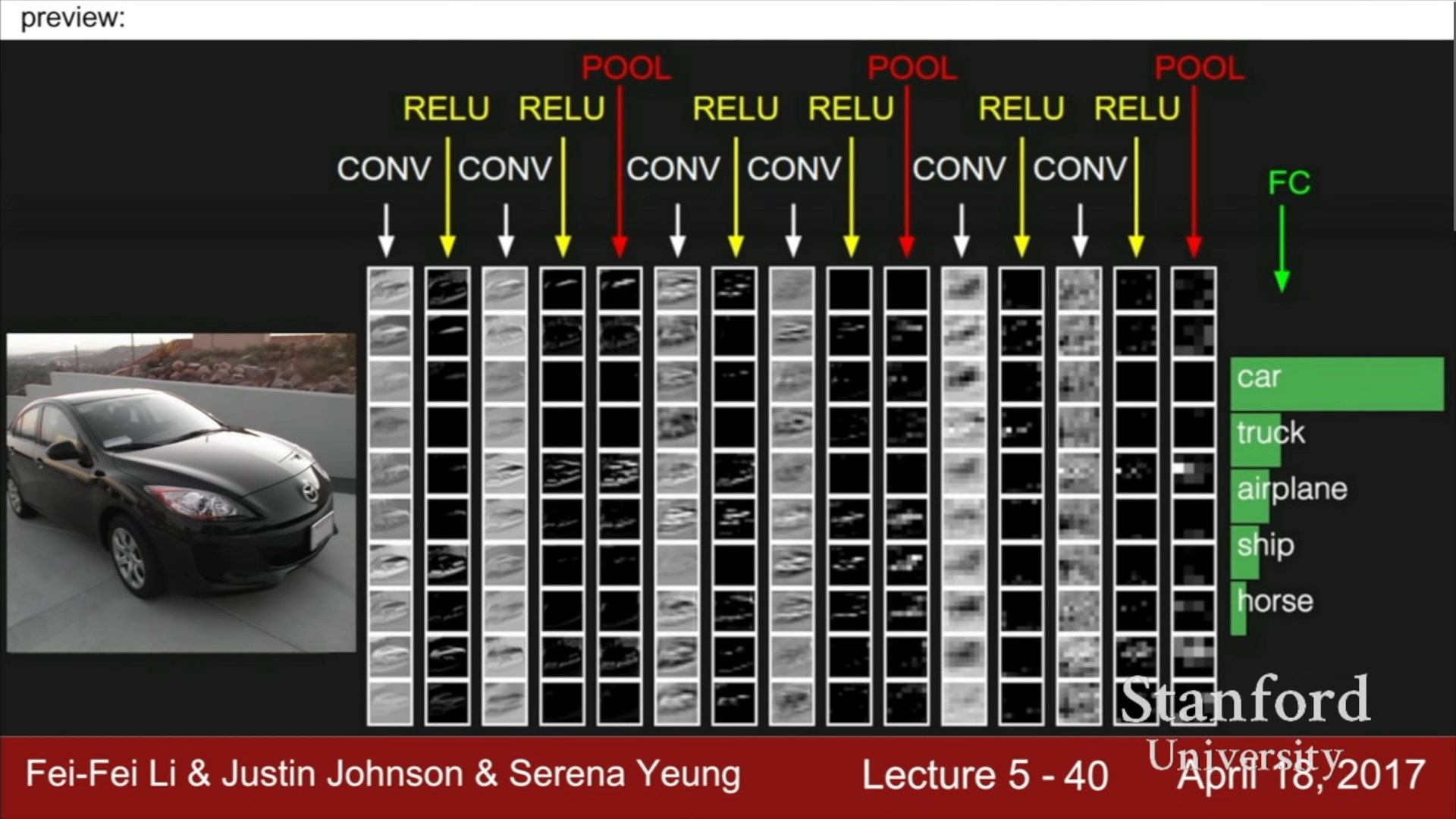 대략적인 ConvNet의 구조는 위와 같다. Convolution Layer와 Non-Linear Layer에 해당하는 ReLU가 몇번 반복되고, Activation map를 Downsampling하는 POOL Layer가 존재한다. (CONV/RENU)^n + POOL 구조가 몇번 반복되고 난 뒤에, 우리가 이전에 살펴보았었던 Fully Connected Layer가 마지막 최종 점수를 구하기 위한 함수로 이용된다.