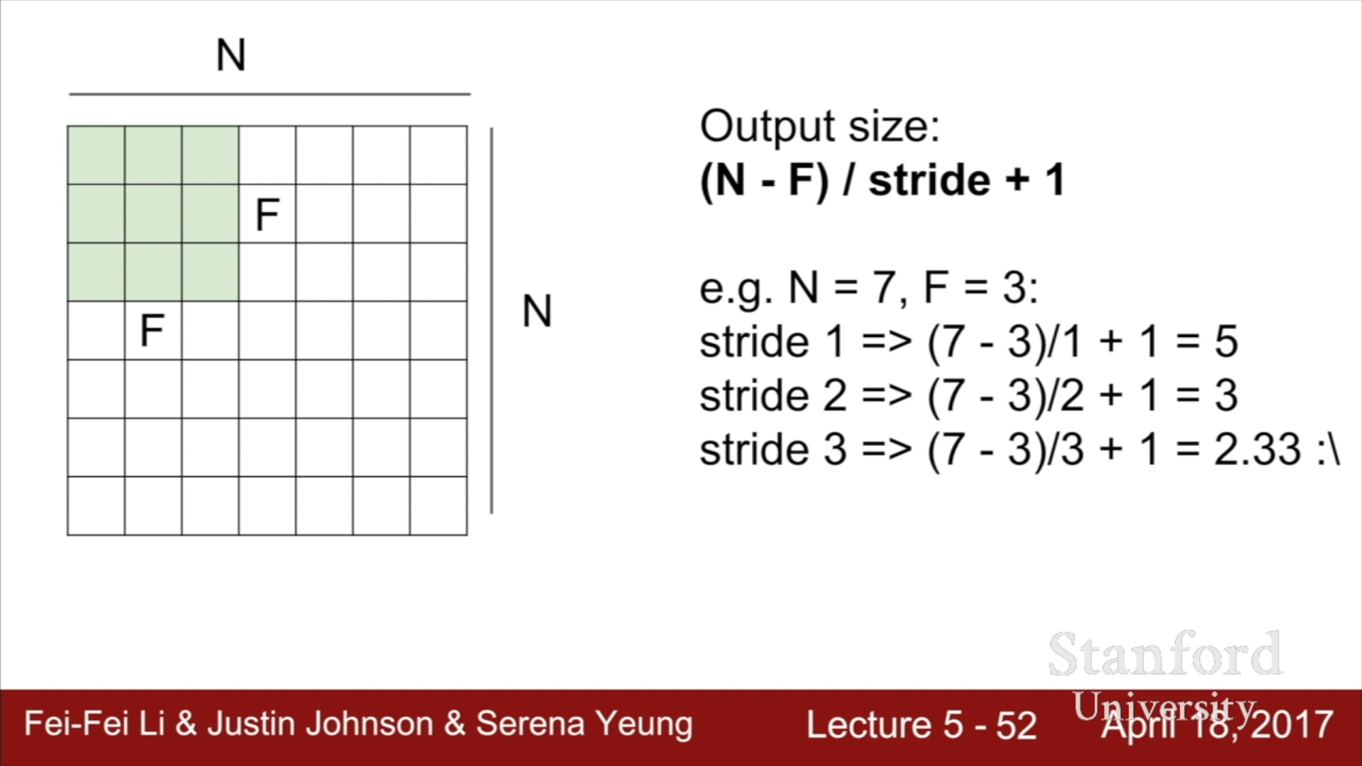 이를 정리하면 위와 같은 공식이 도출된다. N은 이전 input의 크기를, F는 filter의 크기를, stride는 이동시키는 칸 수를 의미한다. (N-F)/Stride의 값이 자연수가 아니라면, map를 제대로 형성할 수 없다는 것을 의미하므로, Stride값은 N-F의 약수들 중 하나여야만 한다.