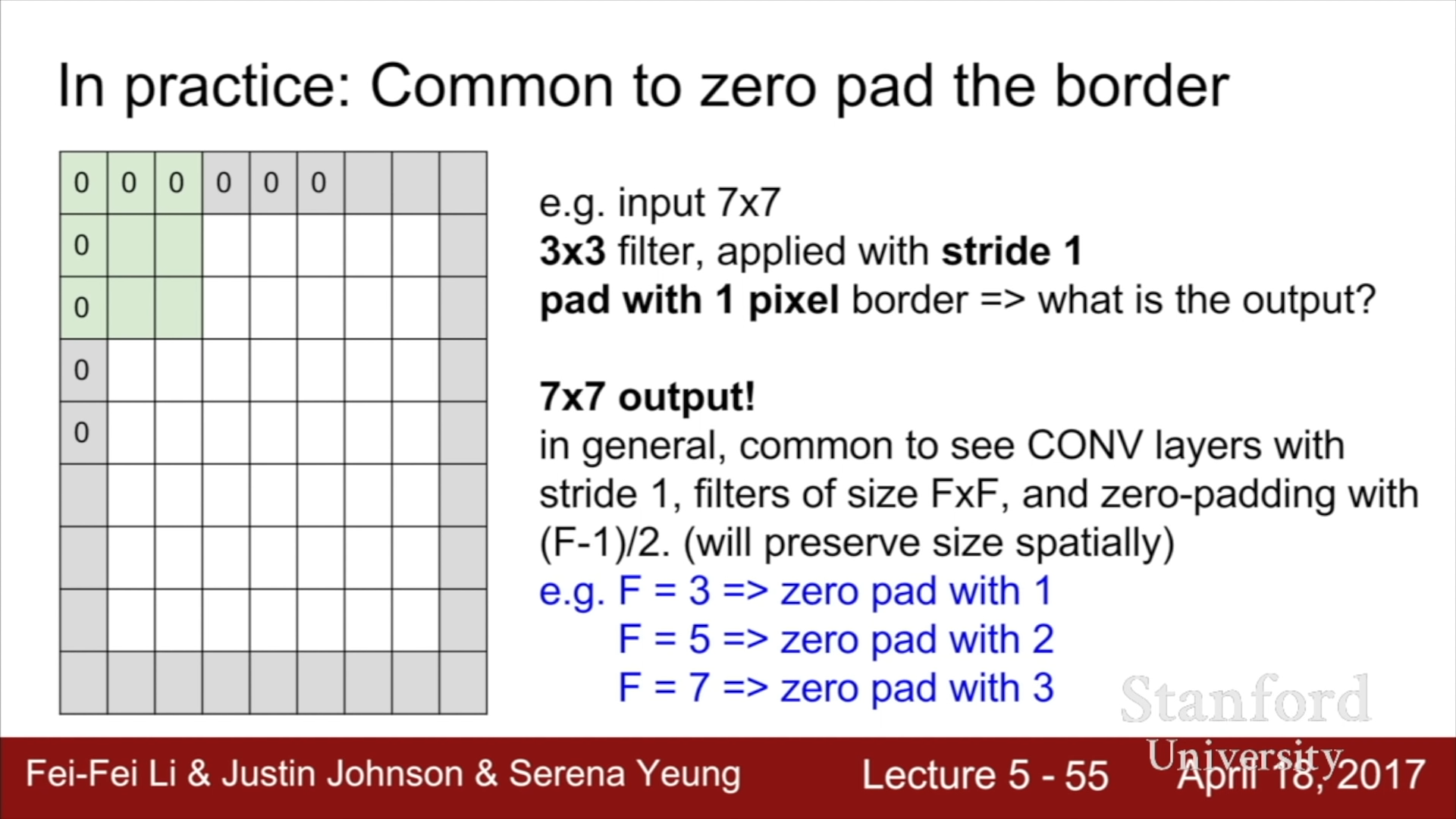 또한, 실제 CONV Layer에서는 Filter size에 따라서 Zero padding의 두께가 달라진다. Stride가 1인 경우로 예를 들자면, 위에 제시된 공식에 따라서 Activation map의 크기는 (N - F + 1) x (N - F + 1)의 크기를 가지게 될 것이고, Input map과 동일한 크기(N)을 유지하기 위해서라면, Zero padding을 (F - 1) / 2 만큼 붙여주어야 한다. 예를 들면 3이라면 1, 5라면 2, 7이라면 3 두께의 padding을 추가해주어야 한다.