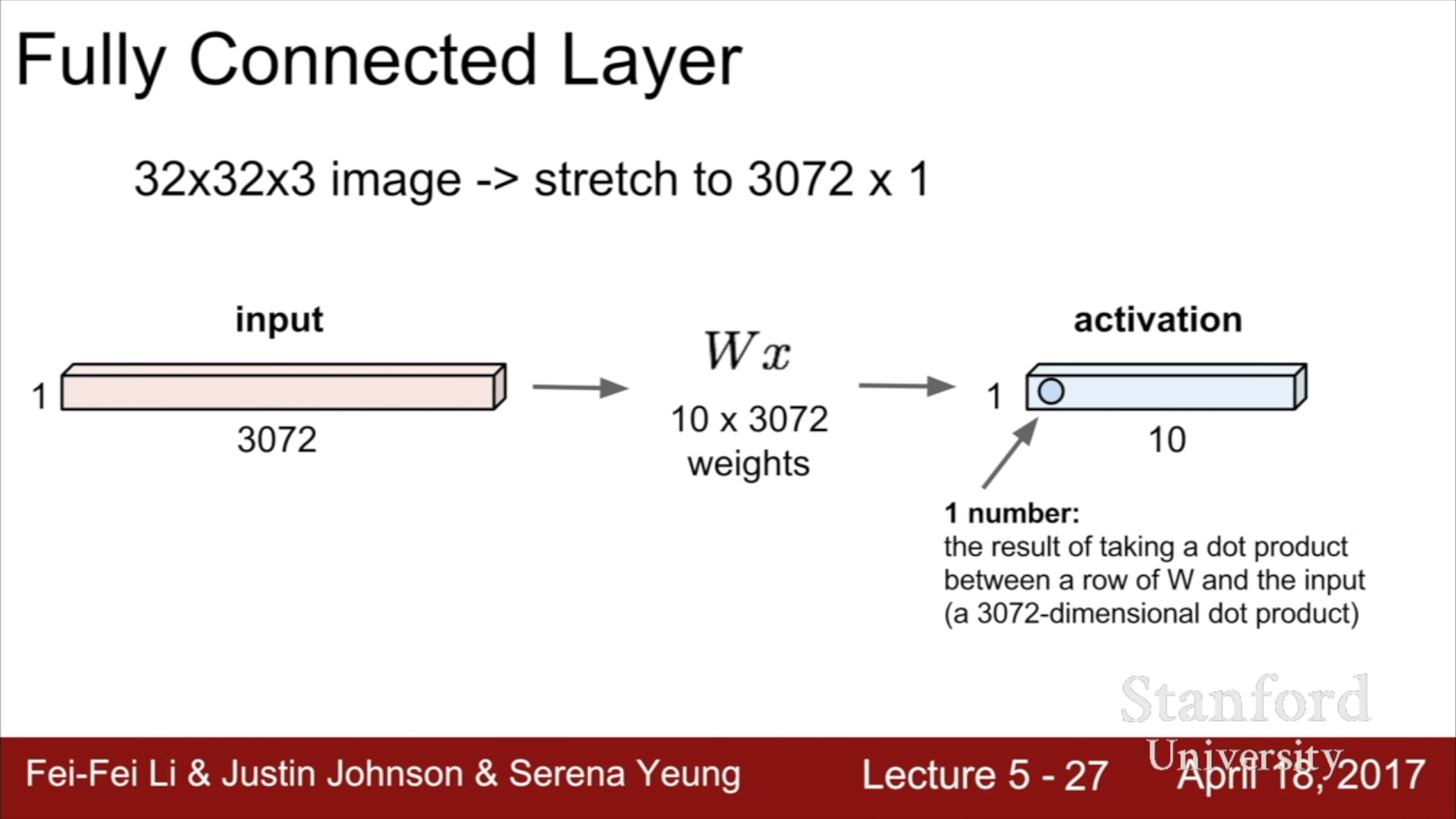 이전까지의 강의에서 다루었던 Fully Connected Layer 를 먼저 살펴보자. 32x32비트 크기의 rgb 정보를 담는 pixel 정보를 이용하기 위해서 32x32x3에 해당하는 3072x1의 Column vector x를 형성하고, 10x3072 크기의 Weights Matrix를 정의하여 Wx의 결과값인 10x1의 Activation map(score)을 생성한다. 이때 10가지의 Score은 각각의 template에 비슷한 정도를 의미하는 척도로 사용된다.