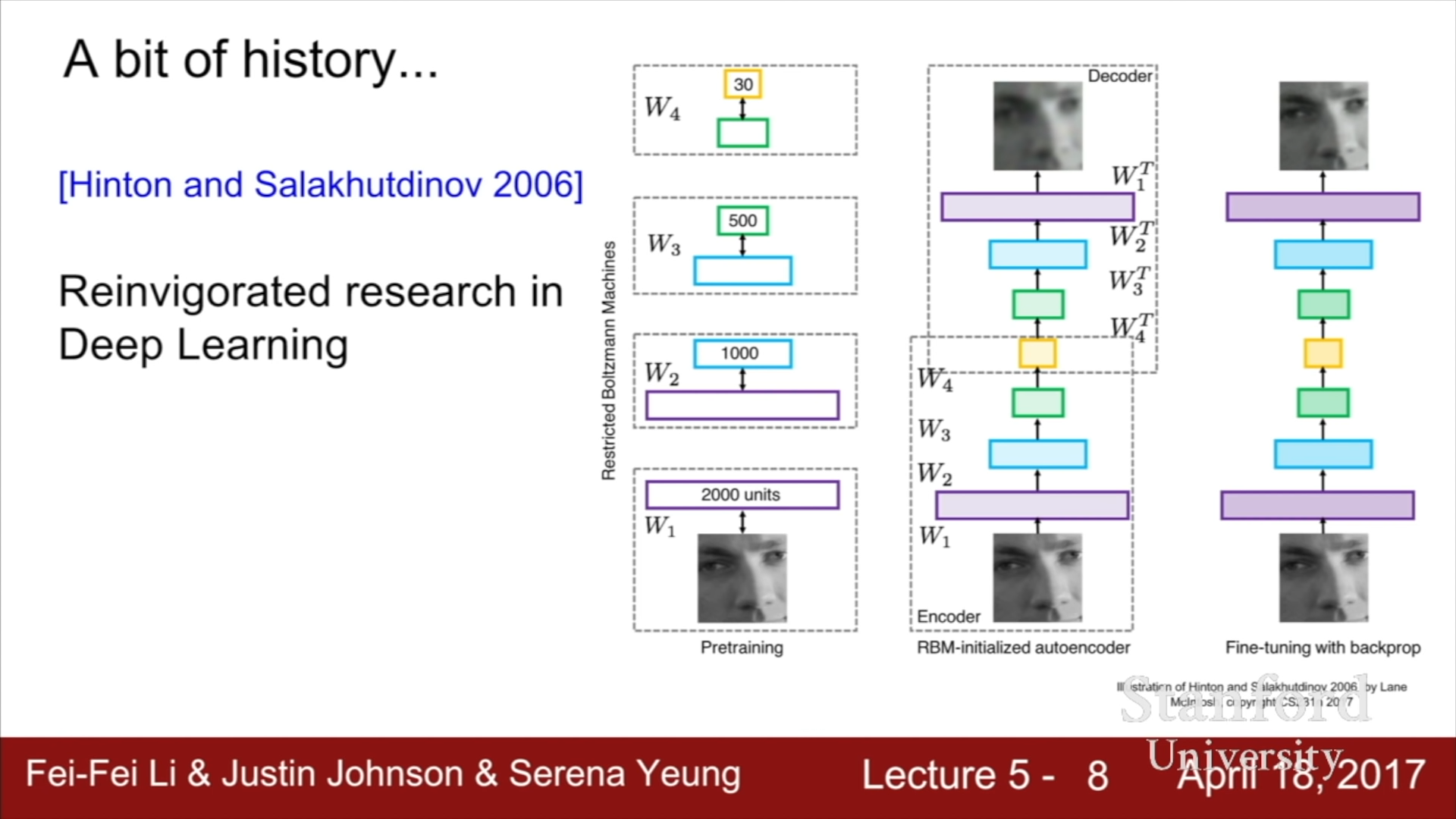 2006년에 Hinton과 Salakhutdinov의 Deep Neural Network를 효과적으로 훈련시킬 수 있다는 논문을 통해 다시 Deep Neural Network에 대한 연구가 활발히 진행되게 되었다. 이 연구는 현대의 Neural Network의 반복과는 상당한 차이가 있지만, Restricted Boltzmann Machine을 통해 각 Layer을 학습시키면서 초기치를 확보하고, 은닉층에 대한 초기치를 전부 확보한 뒤에, 이를 이용하여 전체 Neural Network를 초기화하고, Backprop이나 Tuning을 진행하는 방식이었다.