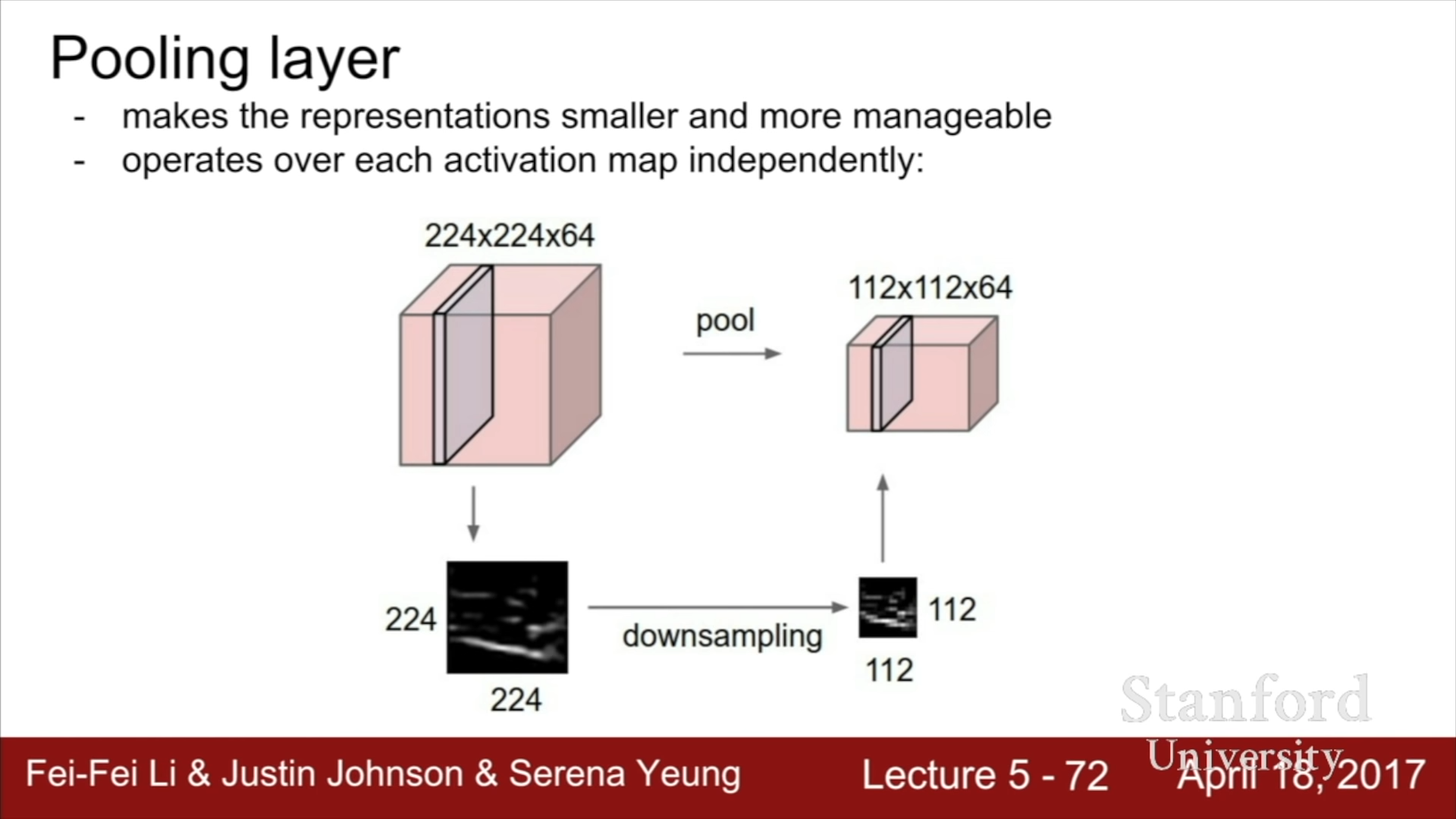 Polling layer의 경우에는 Input depth와 Output depth가 동일하고 단지 각 Output map들의 크기만 줄이는 것을 의민한다. 이 과정에서 사용되는 가장 대표적인 방법이 Max Pooling 방식이다. Max pooling 방식은 max를 구하는 2x2 filter를 stride 2를 가지고 연산을 진행하는 방식이다 이렇게 된다면, 너비와 높이를 절반으로 줄일 수 있다.