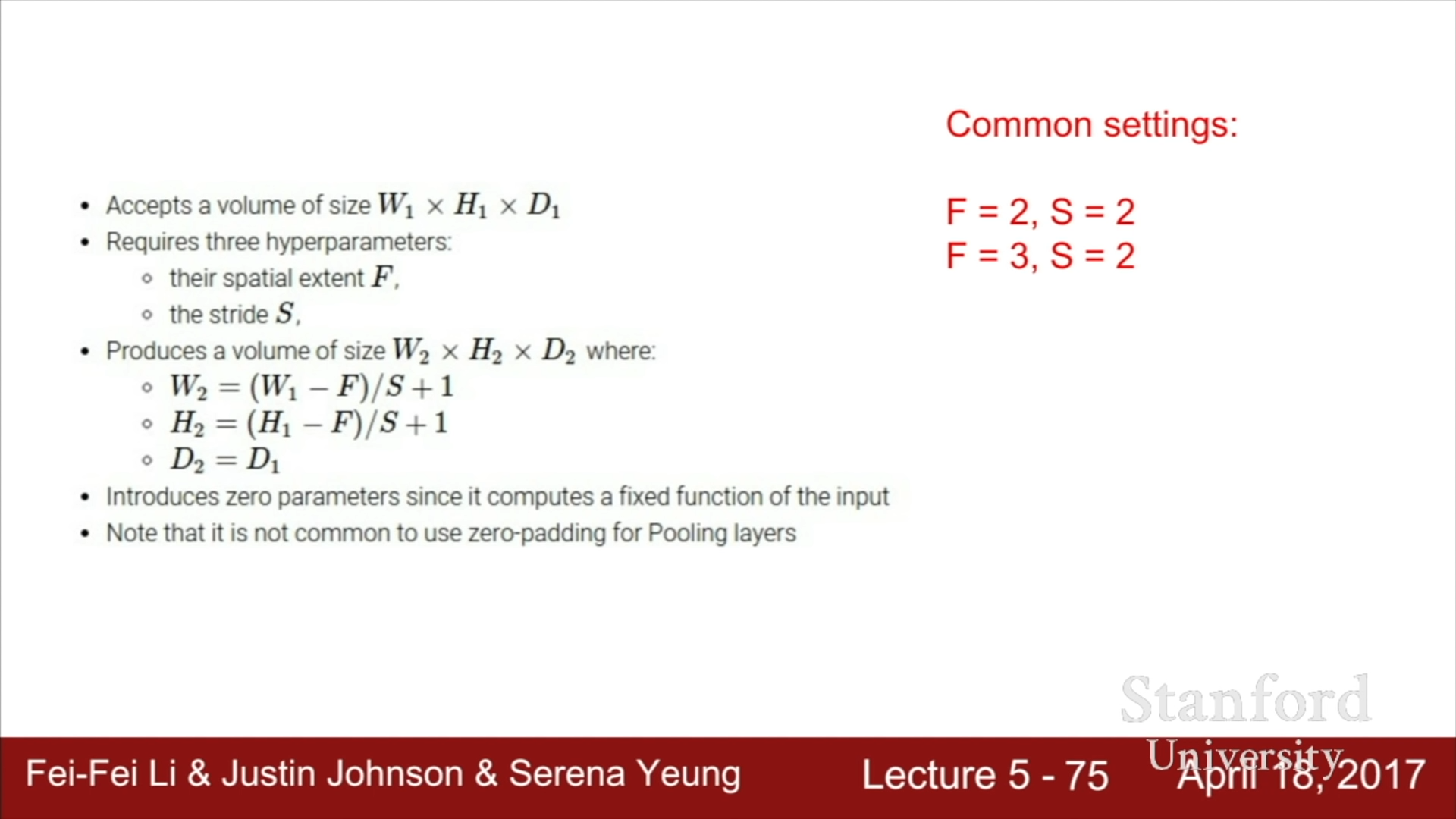 위는 Pooling layer를 이용하여 input의 크기를 줄이는 공식이다. 일반적으론 2x2짜리 필터와 Stride 2, 3x3짜리 필터나 Stride 3의 설정을 사용하여 Pooling을 진행한다.