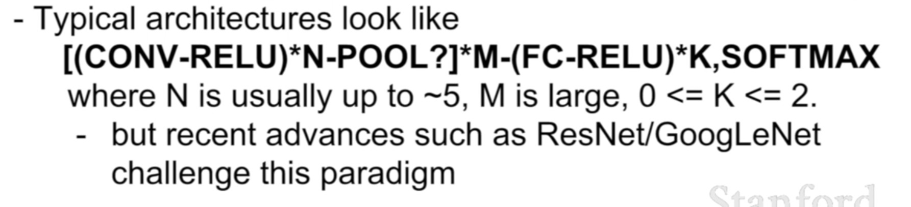 최종적인 구조는 위와 같다. (CONV - RELU) 가 N번 진행된 후 POOL을 거치는 과정을 M회 반복한다. 이후 최종적인 score 도출을 위해 Fully Connected layer과 ReLU function을 이용하는 과정을 1에서 2회 반복한다, 이후 SoftMax function을 통해 최종적인 score과 정답이 얼마나 차이가 나는 지를 확인할 수 있게 된다.