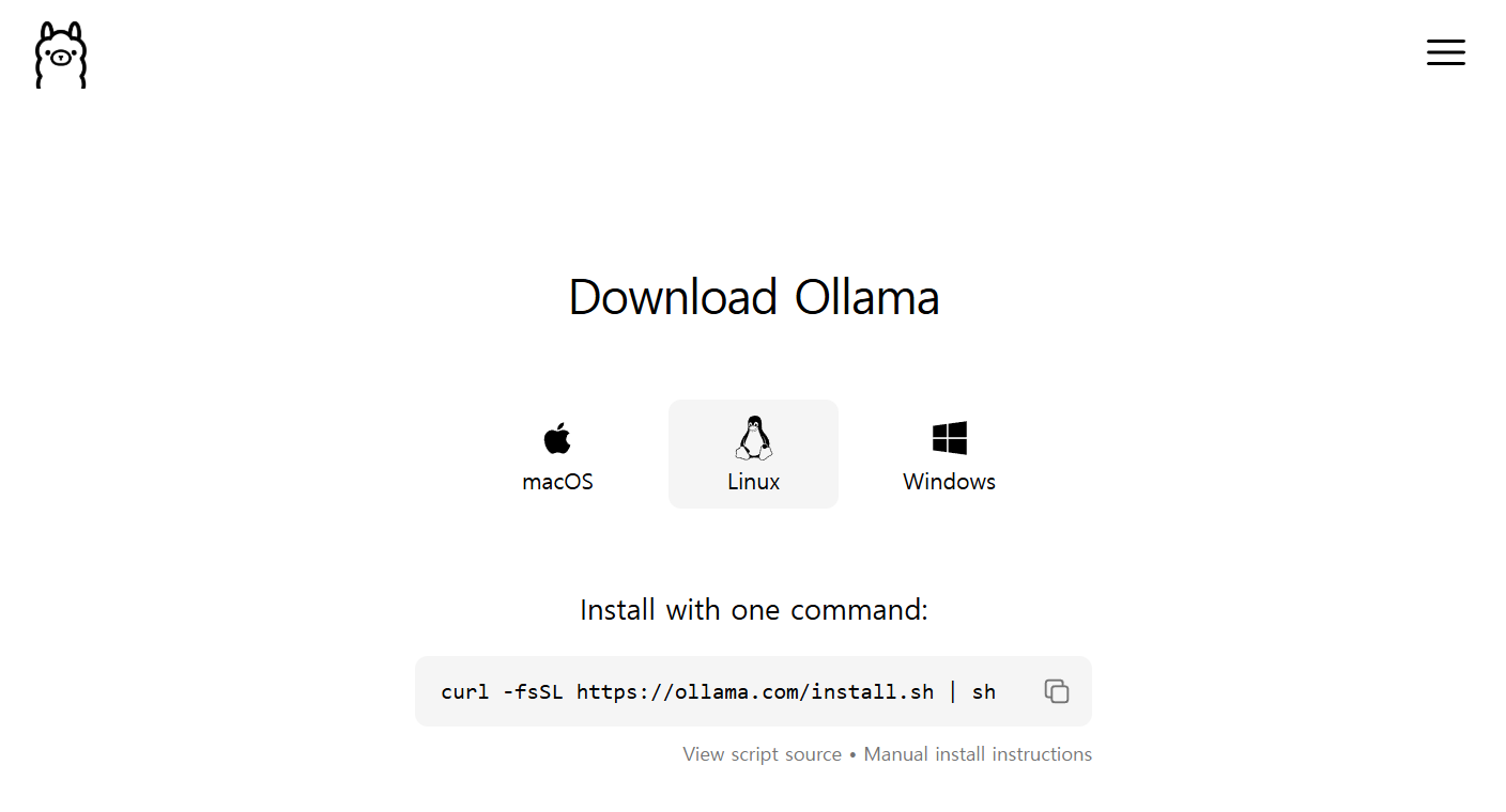 Deepseek coder 모델 설치를 위해 Ollama 설치를 진행해야 한다. Ollama는 Open Source Model을 Local 환경에서 구동할 수 있도록 해준다. 설치할 환경은 아래와 같다.
