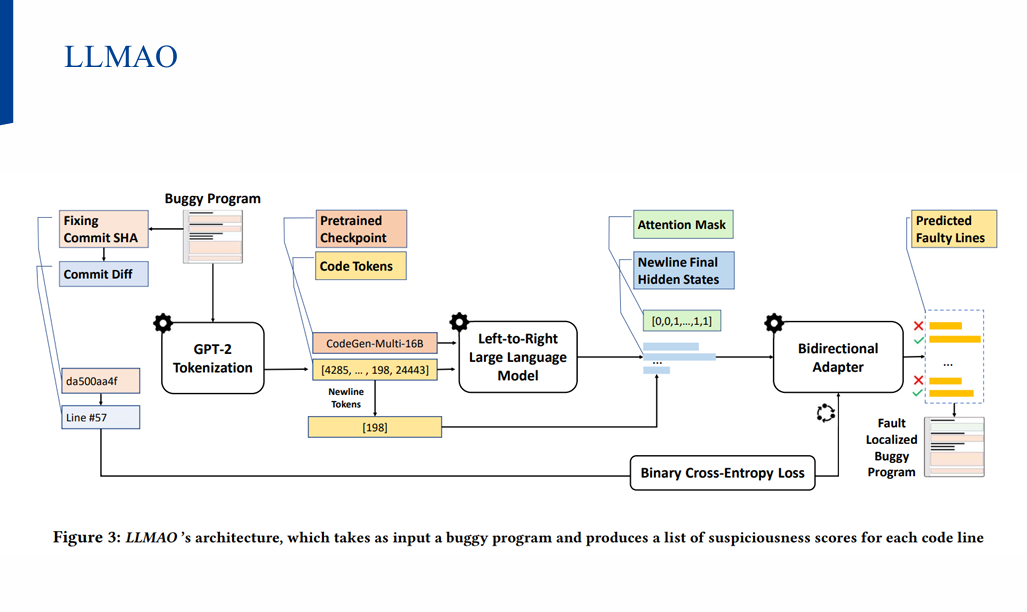 LLMAO (Large Language Models for Automated fault localization)는 테스트 없이도 결함 위치를 추론할 수 있는 대형 언어 모델 기반 버그 로컬라이제이션 기법입니다. 기존 통계 기반(SBFL)·머신러닝 기반(MLFL) 접근법의 한계를 극복하고, 프로그램 분석 도구나 테스트 케이스 없이도 효과적인 결함 탐지를 수행합니다.