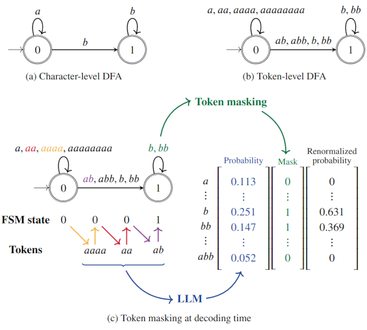 FSM(DFA)는 기본적으로 Character 단위로 생성된 Automata이고, LLM은 Token단위로 Decoding을 진행한다. 따라서 이 간극을 처리하는 것이 Constrained Decoding의 핵심이다.