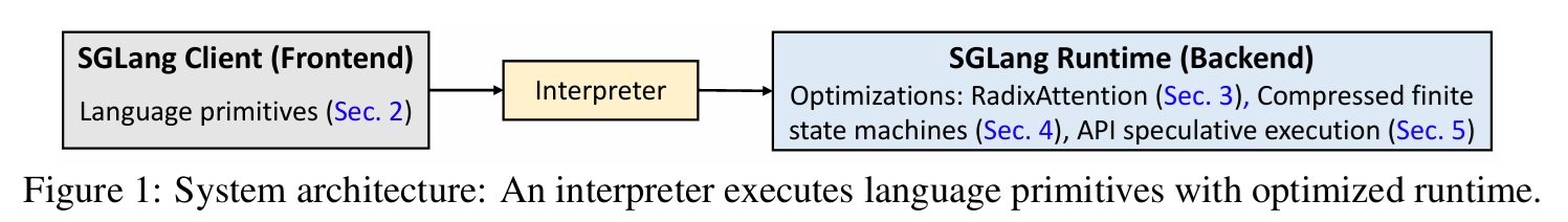 먼저 Front-End 단에서는 Python 언어로 SGLang을 embed해서 native python syntax를 사용하여 prompting workflow를 편집할 수 있도록 했다.