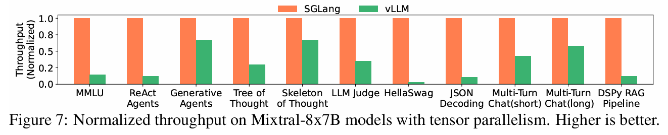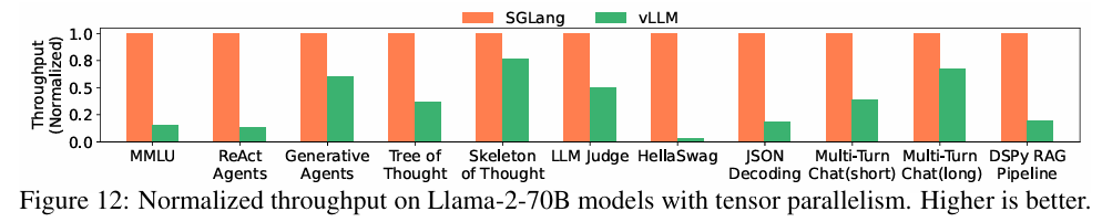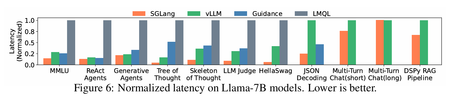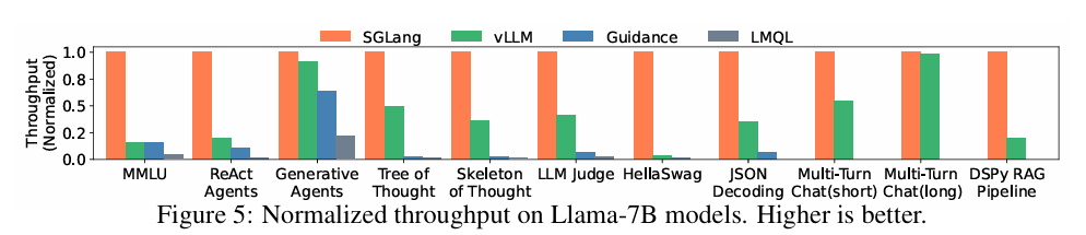 SGLang은 LM program을 direct programming할 수 있게 해주기도 하고, back-end 또한 구현하기 때문에 비교를 위한 Baseline으로 Guidance와 LMQL 그리고 마지막으로 Back-end 단에 해당하는 vLLM을 baseline으로 설정했다.