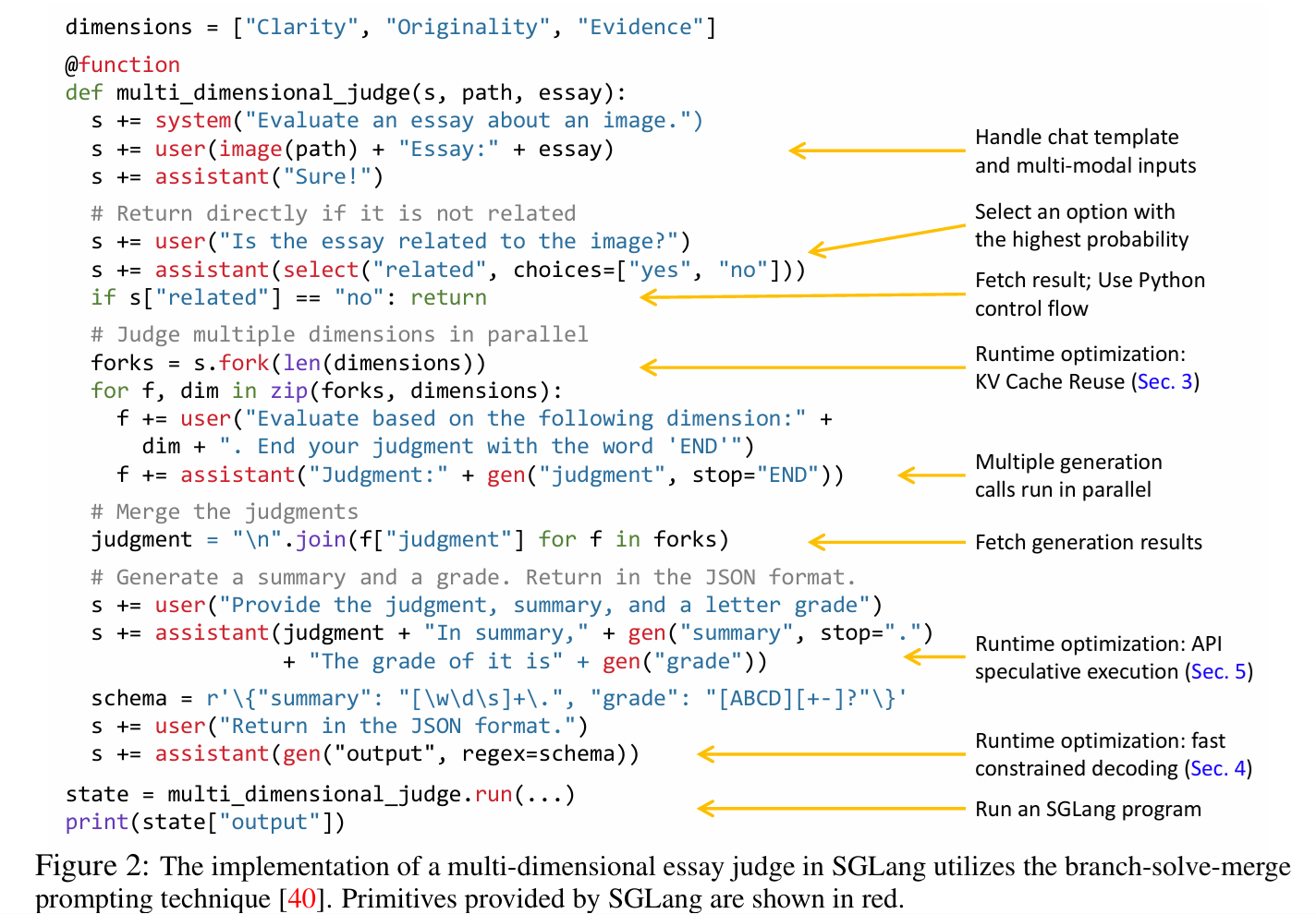 위 Figure 2에서는 python으로 작성된 Domain-specific language 언어를 사용하여 실제로 위의 Task 수행을 위한 코드를 보여주고 있다. System 명령어로 공통 프롬프트를 넣어주고, Image와 Essay 명령어로 필요한 값을 입력해준다. 이후 select 명령어를 통해 yes, no 둘 중에서 더 높은 확률을 가진 값을 파악하여 연관성을 파악한다. 그 이후에 parllel evaluation을 진행하는데, 미리 정의해둔 dimension 각각의 시각을 활용하여 해당 수 만큼 fork 명령어로 동일한 evaluation을 진행한다. 최종적으로 모든 답변을 종합하여 regex 포맷에 맞는 최종 답변을 생성하는 과정으로 진행된다.