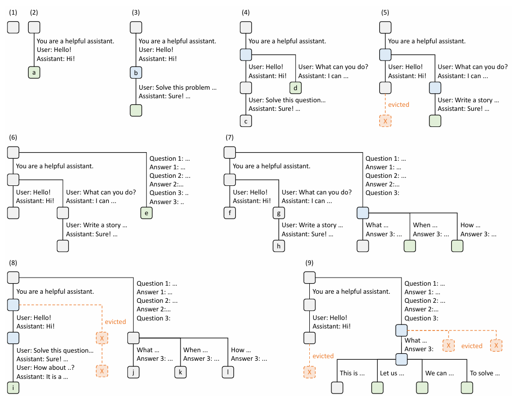 위 Figure 3 예시를 통해서 RadixAttention의 Evict와 KV Reuse 정책을 확인할 수 있다. Evict는 Leaf노드에서부터 진행되며 Prefix는 한번만 저장되어도 충분하기 때문에 공간 효율적 저장이 가능하다.