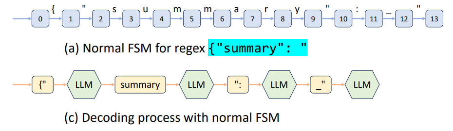 다만 기존의 방법론들은 Regex를 사용한 Finite State Machine을 생성하는 과정에서 Constant String을 한번에 처리하지 못하는 문제가 존재했다. 결과적으로 바로 다음에 나올 Token들이 고정되어 있음에도 불구하고, 의미없는 LLM query를 보내 낭비하는 문제가 발생한다는 것이다.