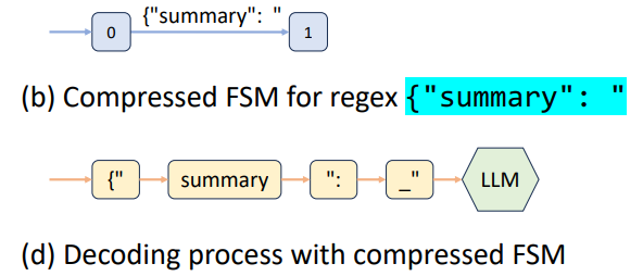 위의 (a)의 예시에서 Singular Transition Edge(DFA의 다음 state가 고정되어 있고, Transition 또한 하나의 character를 통해서만 처리가 가능하면 singular transition edge임.)를 한번에 묶어서 Compressed edge로 표현하는 것을 볼 수 있다. 이렇게 되면, 불필요한 LLM Query를 없애고 한번에 multi-token decoding을 진행하는 효과를 볼 수 있다.