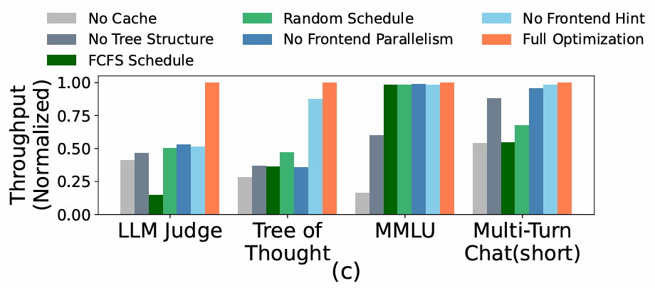 No Cache: KV Cache를 사용하지 않고 전부 재계산No Tree Structure: Table based Cache 사용FCFS Schedule: 논문에서 제안한 겹치는 것이 많은 순으로 처리 하지 않고 FCFS로 처리Random Schedule: 랜덤 순서대로 프롬프트를 처리No Frontend Parallelism: 인터프리터 병렬 처리 제거No Frontend Hint: Fork Hint를 제거Full Optimization: 논문에서 제안하는 모든 방법 사용