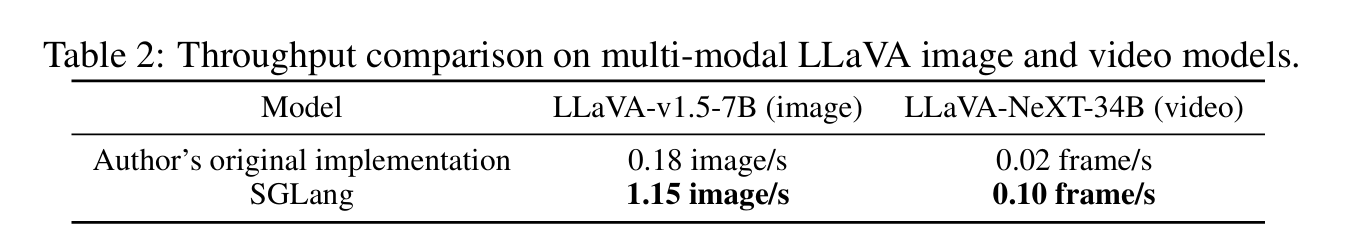위 Table은 Image와 Video 도메인을 포함하는 multi-model model에 대한 처리량을 비교한 지표이다. 기존 Token을 사용하는 텍스트 도메인 LLM과 동일하게 KV cache를 사용하는 방식으로 처리량을 늘렸는데, 이때 하나의 token에 해당하는 것이 이미지의 hash값에 해당한다. 따라서 동일한 이미지나 영상이라면 동일한 KV 값을 사용할 것이기 때문에 이에 대한 최적화가 가능하다.