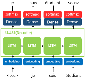 Decoder에서 출력할 단어를 예측하는 과정에서 Softmax function이 쓰인다. 최종 출력값을 예측하는 과정에서 Greedy Search나 Beam Search등등을 사용하려면, 확률값을 알아야 한다. 이를 위해서 선택할 수 있는 모든 단어들의 각 시점에서의 확률을 구하는 함수를 사용해야 하는데, 이때 쓰이는 것이 Softmax 함수이다.
