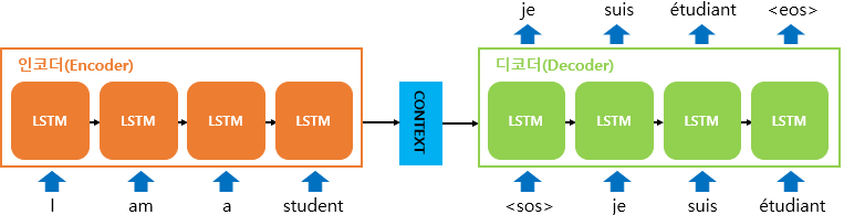 Seq2Seq 모델은 크게 Encoder, Decoder module과 그 사이를 연결해주는 Context Vector로 이루어져 있다. Encoder는 입력 문장 단어들을 순차적으로 입력 받아 Context Vector를 생성하는 역할을 하고, Decode는 입력받은 Context Vector를 바탕으로 출력을 순차적으로 진행한다.